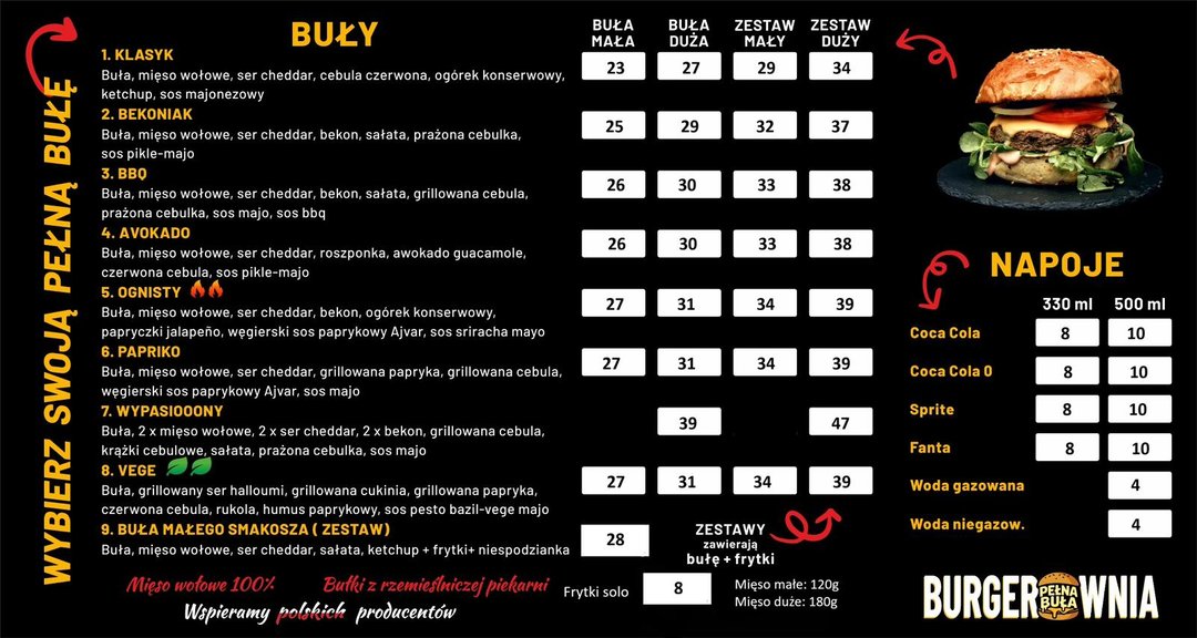 Burgerownia Pełna Buła Burger to miejsce, które było marzeniem, a stało się spełnieniem! Stworzone z sercem dla Was, aby każdy mógł wybrać swoją Pełną Bułę. Działamy w Nowym Żmigrodzie i serwujemy pyszne, soczyste burgery z najwyższej jakości składników. Dlaczego my? Bo stawiamy na świeżość, smak i Twoje zadowolenie! Wyróżniamy się kreatywnymi recepturami i atmosferą, która sprawi, że poczujesz się jak w domu. U nas znajdziesz pozycje mięsne, wege czy wegańskie, więc każdy znajdzie coś dla siebie! Sprawdź nasze menu i zamów już dziś! PS. Składajcie zamówienia do 20.30, bo potem już sprzątamy sterylnie nasz sprzęt..